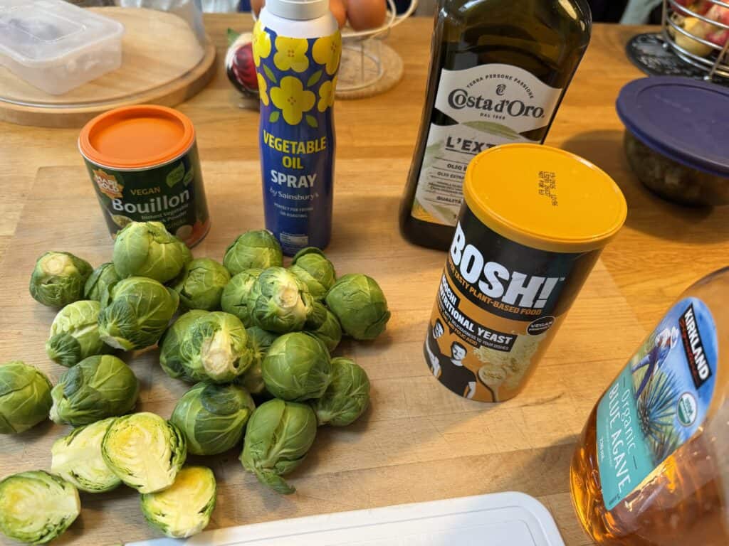 First, get your ingredients. The main ingredients are bouillon which I prefer instead of salt, vegetable oil spray, hot smoke point for example, rapeseed oil. Olive oil, but to use once they are roasted, some nutritional yeast and maybe some agave syrup if you are into sweet stuff and even some lime juice.